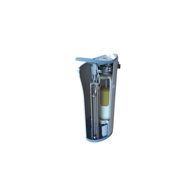 El mueble está diseñado pensando en la máxima comodidad y resistencia, gran boca de carga de sal, tapa con bisagras plásticas de gran resistencia. El descalcificador está dividido en dos compartimentos uno para la sal y otro para el depósito de resinas y el sistema de comando, de esta manera se evita la corrosión producida por la sal.