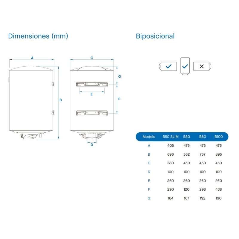 Biposicional, se puede instalar tanto en vertical como horizontal, con las tomas de agua mirando hacia la izquierda.